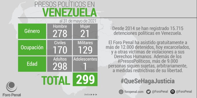 La ONG Foro Penal informó este miércoles 2 de junio que en Venezuela se mantiene en la actualidad 299 presos políticos.