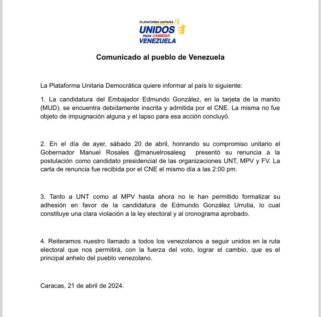 Mediante un comunicado, la organización señaló que el gobernador del estado Zulia, Manuel Rosales, retiró su candidatura por dichos partidos ante el CNE. Asimismo, denunció que no se les ha permitido a las toldas políticas sumarse a la candidatura de González, elegido como sustituto de María Corina Machado.