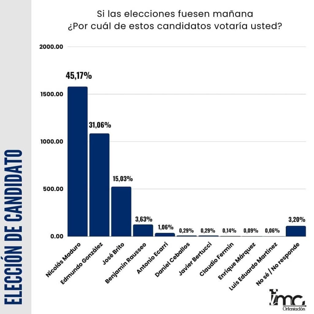 Según el más reciente estudio de IMC Orientación, si las elecciones fueran mañana, el 45,17% de los encuestados votaría por Nicolás Maduro, seguido con 31,06% por Edmundo González y José Brito con el 15,03% de intención de voto.