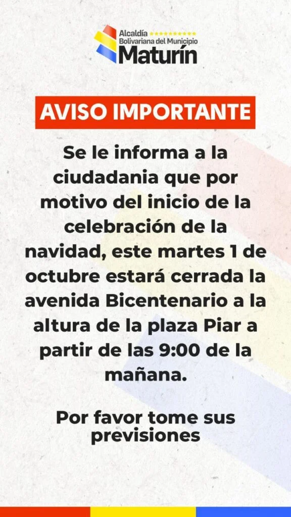 Este martes 1 de octubre, la alcaldía de Maturín, estado Monagas, informó sobre el cierre de la avenida Bicentenario desde las 9:00 A.M.