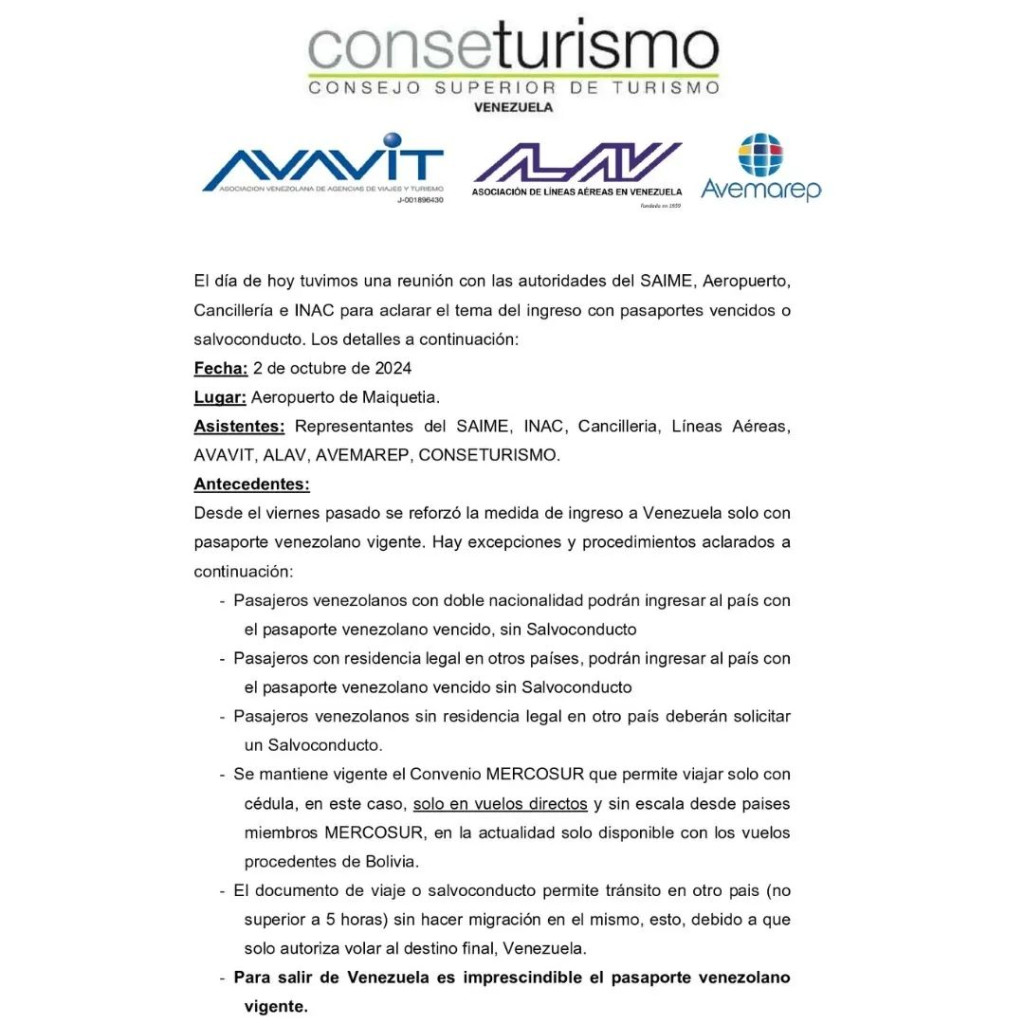 La Asociación de Líneas Aéreas de Venezuela (ALAV), publicó un comunicado, donde dio a conocer un acuerdo pactado por varias autoridades sobre el ingreso de venezolanos al país con el pasaporte vencido.