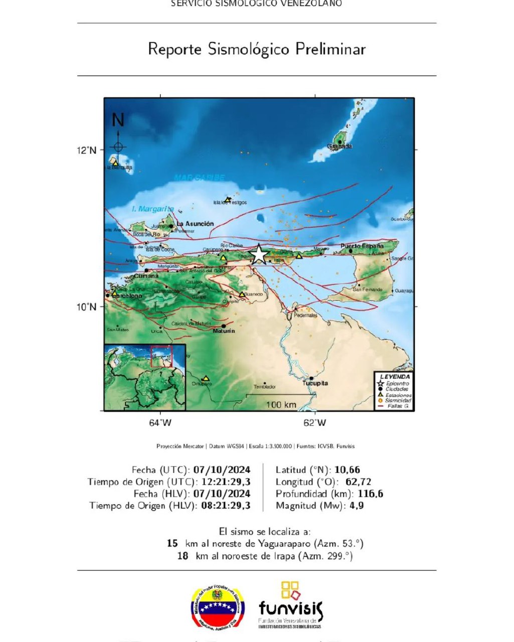 La Fundación Venezolana de Investigaciones Sismológicas (Funvisis), reportó este lunes, 07 de octubre, un sismo de magnitud 4,9 en el estado con epicentro en Yaguaraparo.