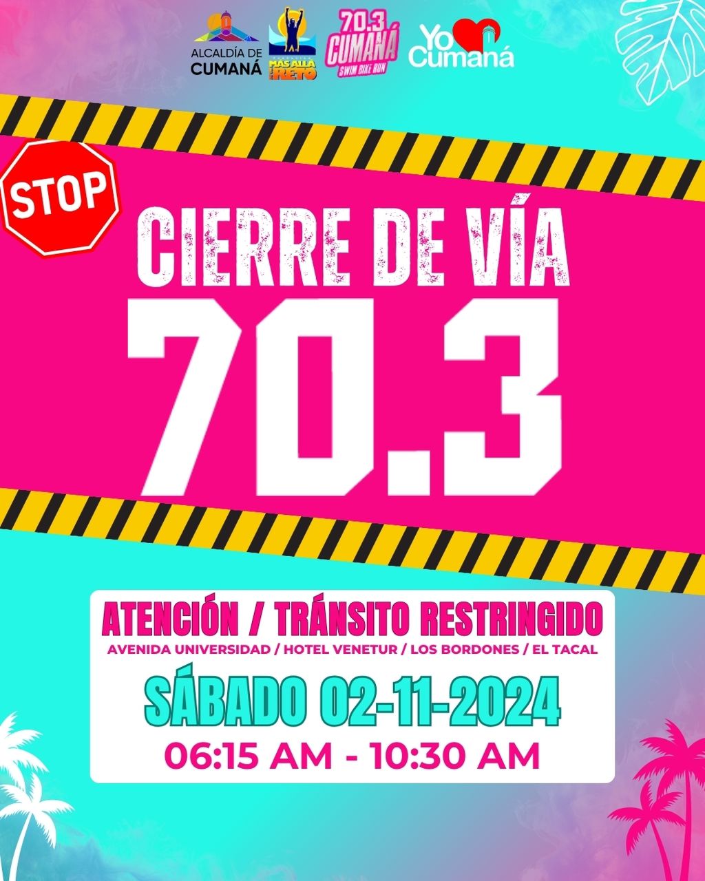 La fundación Más Allá de un Reto, informó que el tránsito entre la avenida Universidad y la autopista Cumaná-Puerto La Cruz, será cerrado el próximo 02 de noviembre, con motivo del V Triatlón Media Distancia 70.3 y el VII Triatlón Sprint y Olímpico Ciudad Cumaná.
