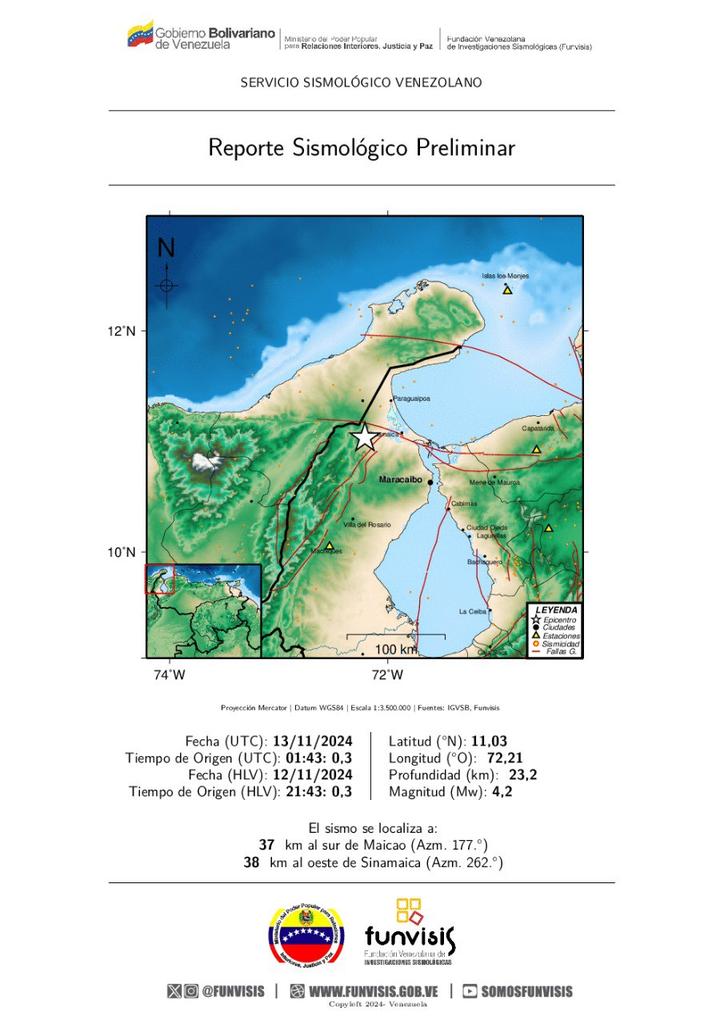 La Fundación Venezolana de Investigaciones Sismológicas (Funvisis) informó sobre un sismo de magnitud 4.2 que se extendió por varias regiones del estado Zulia, la noche del martes 12 de noviembre.
