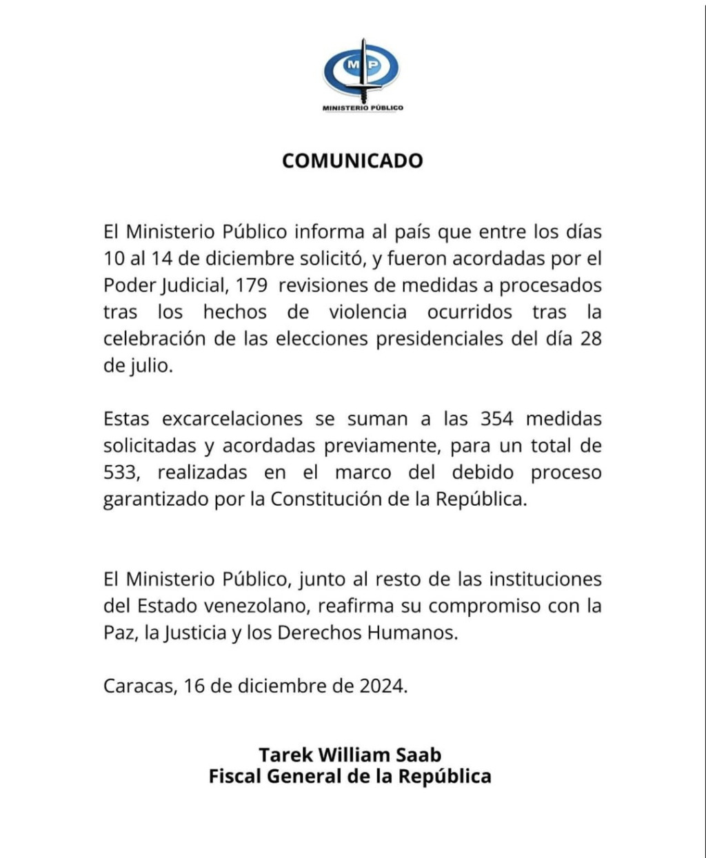 El Ministerio Público (MP) confirmó este lunes la excarcelación de 179 personas detenidas durante las protestas postelectorales del 28 de julio registradas en todo el país.