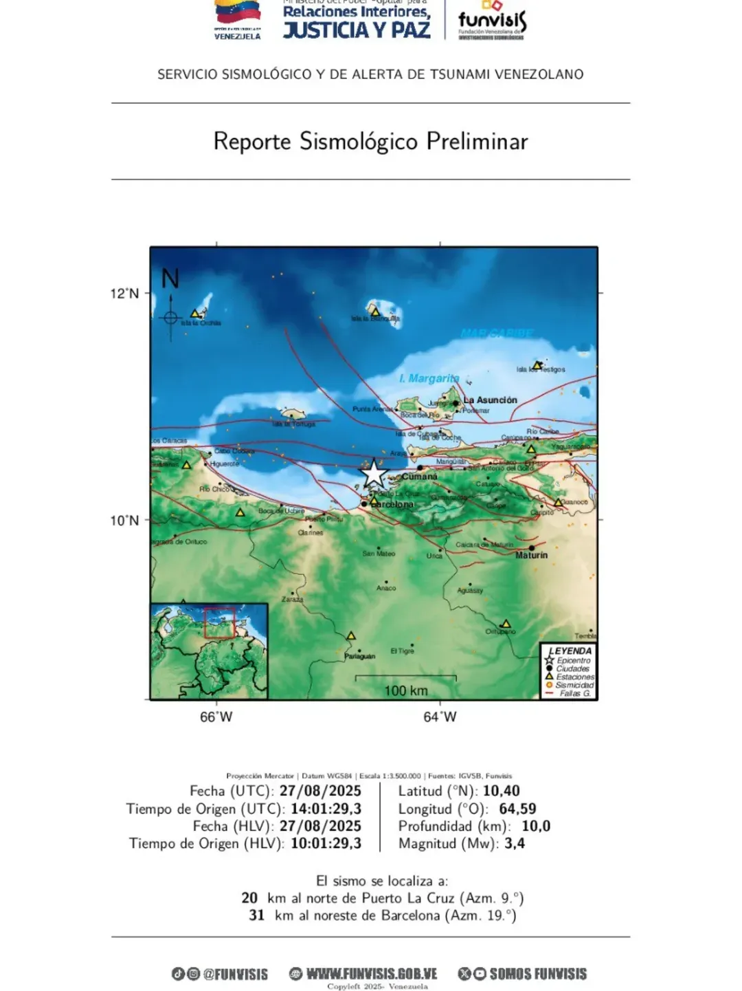 La Fundación Venezolana de Investigaciones Sismológicas (Funvisis) reportó un sismo de magnitud 3.4 en el estado Anzoátegui, durante la mañana de este miércoles, 27 de agosto.