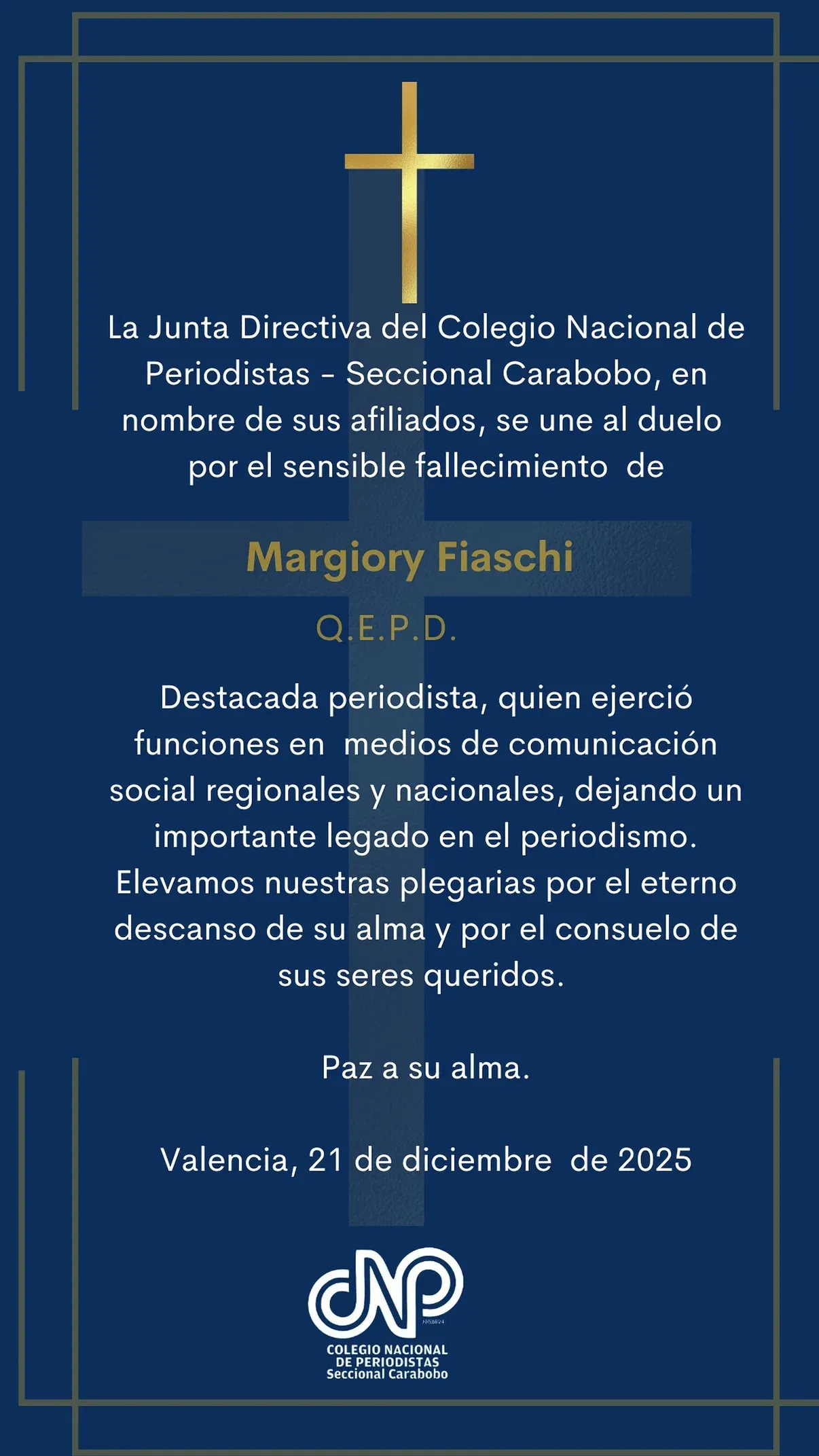 La noticia fue dada a conocer por el Colegio Nacional de Periodistas (CNP), seccional Carabobo, en sus redes sociales, destacando la labor de la comunicadora social en los medios regionales y nacionales.