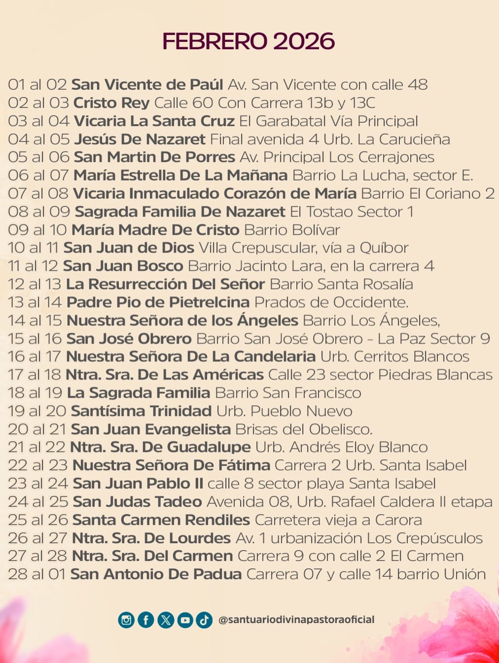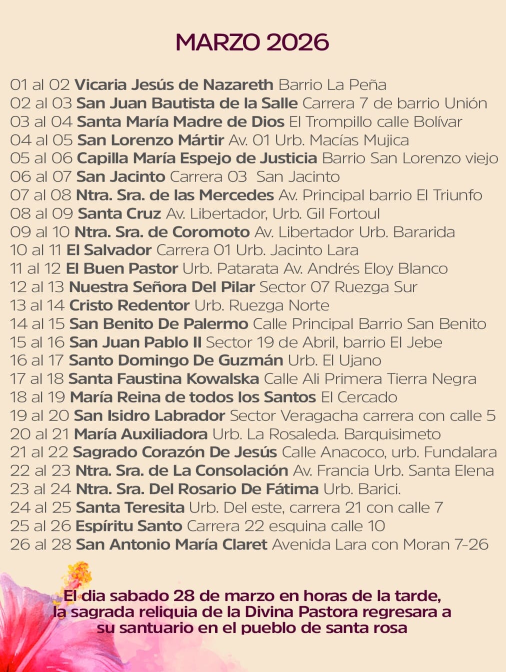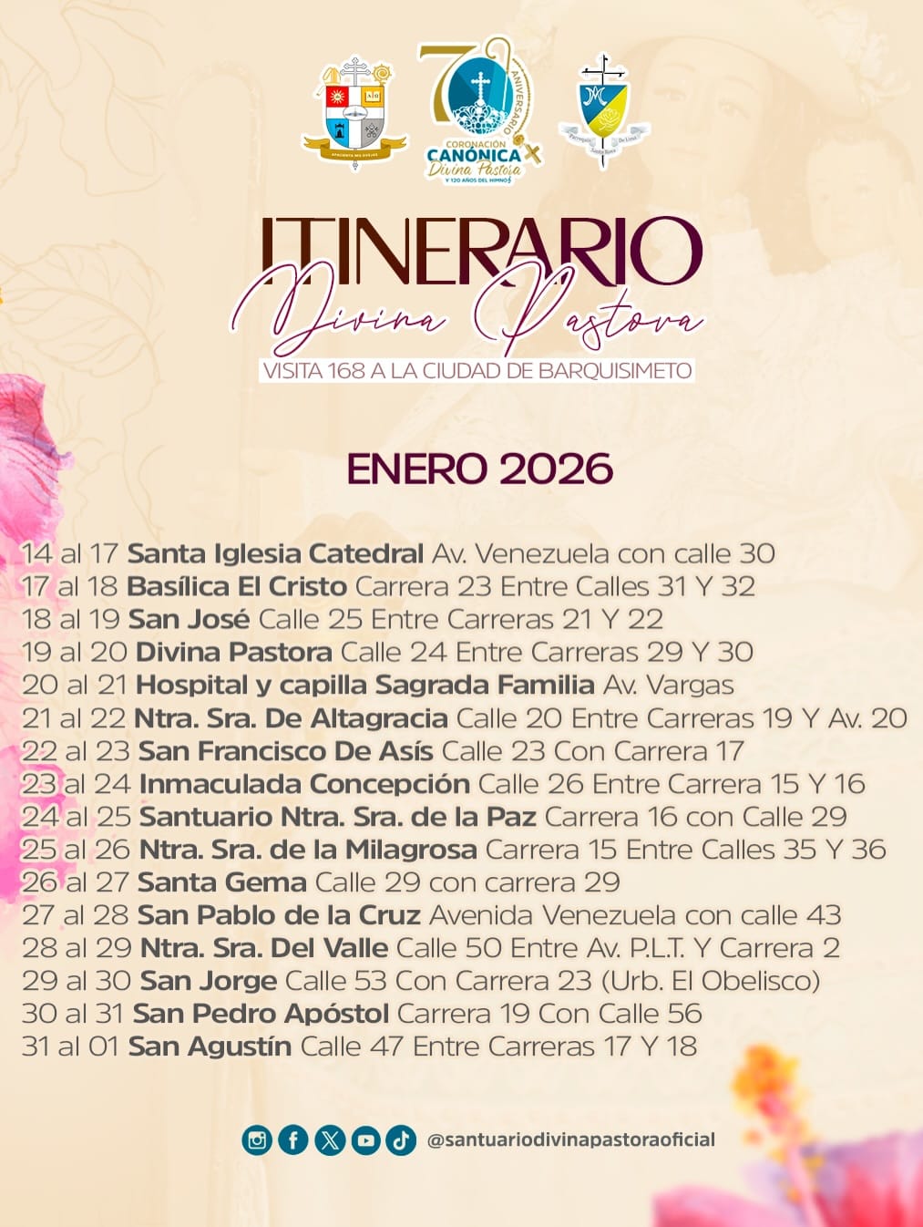 De acuerdo al cronograma presentado por la Arquidiócesis de Barquisimeto, el recorrido iniciará desde el Santuario de Santa Rosa, donde reposa la imagen, pasando por las 52 parroquias de la ciudad, proceso que culminará el próximo 28 de marzo cuando la Divina Pastora retorne a su hogar.