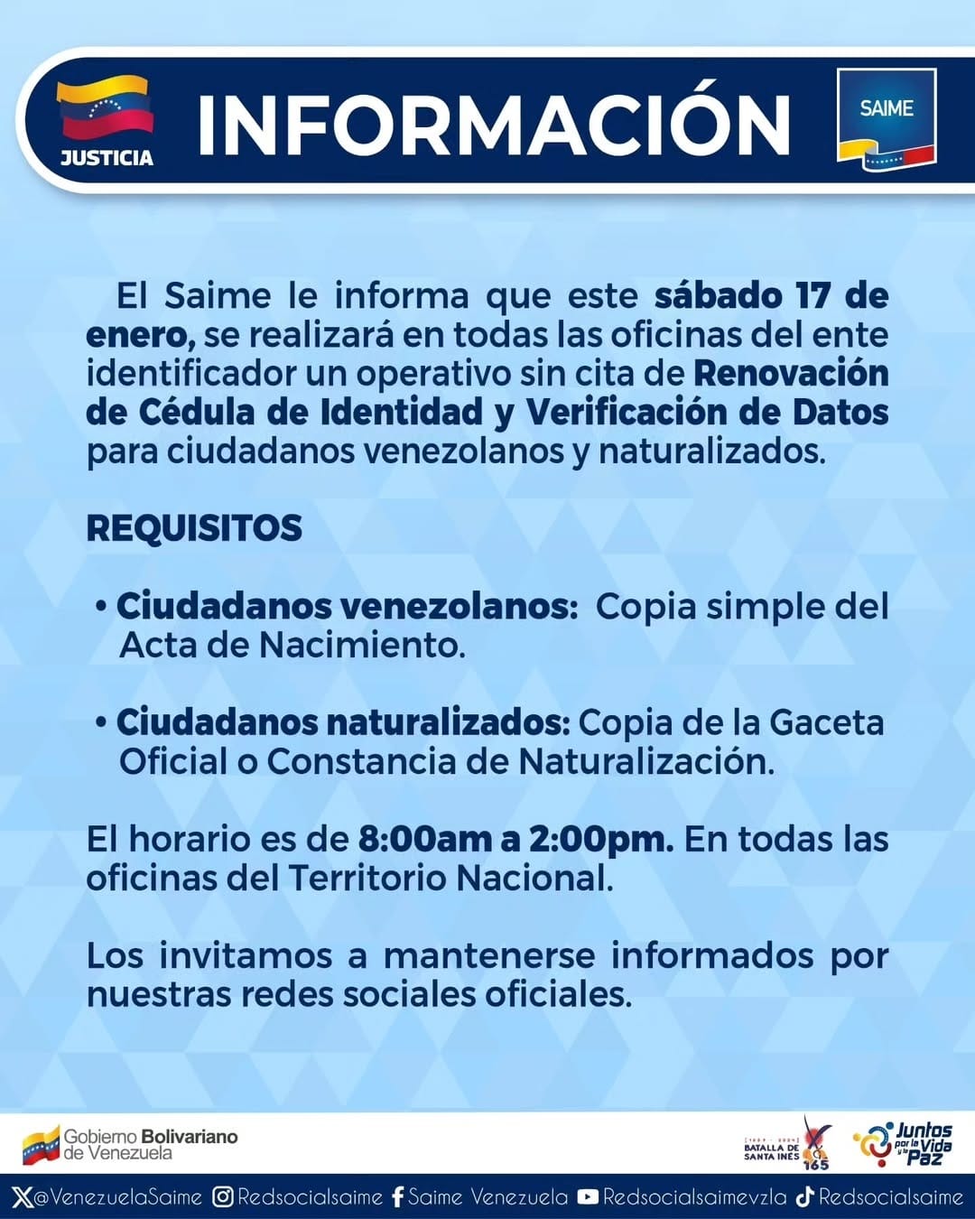El Servicio Autónomo de Identificación, Migración y Extranjería (Saime), anunció en su cuenta de Instagram que llevará a cabo una jornada de renovación de cédulas y verificación de datos sin cita en todo el territorio nacional el próximo sábado, 17 de enero.