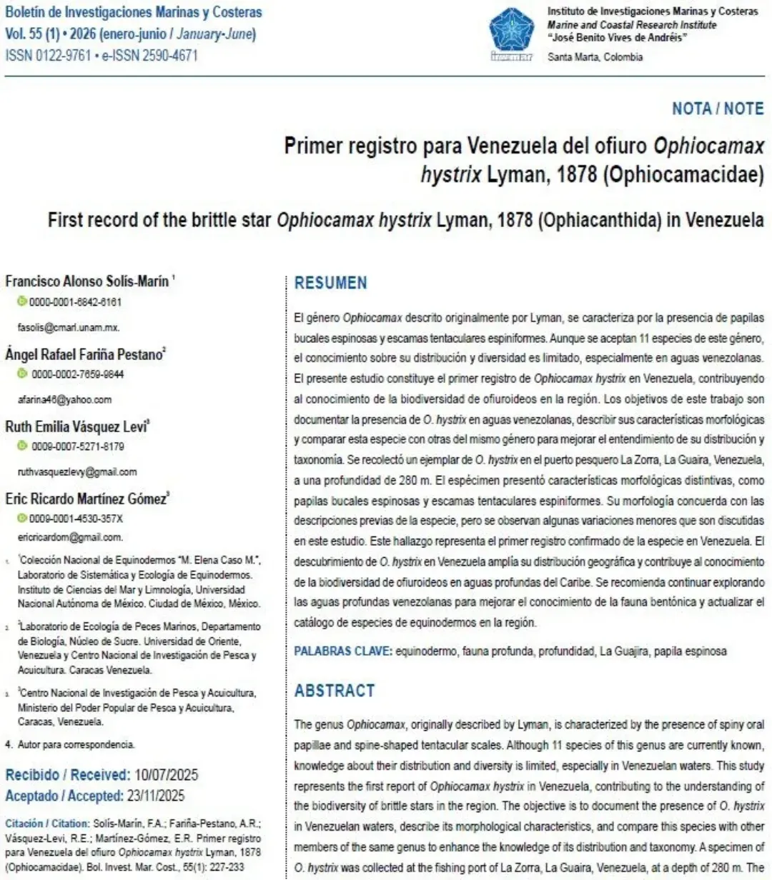 El Centro Nacional de Investigación de Pesca y Acuicultura (Cenipa) anunció el miércoles, 14 de enero, el primer avistamiento en aguas venezolanas del ofiuro Ophiocamax hystrix, también conocido como estrella de mar frágil, en aguas venezolanas.