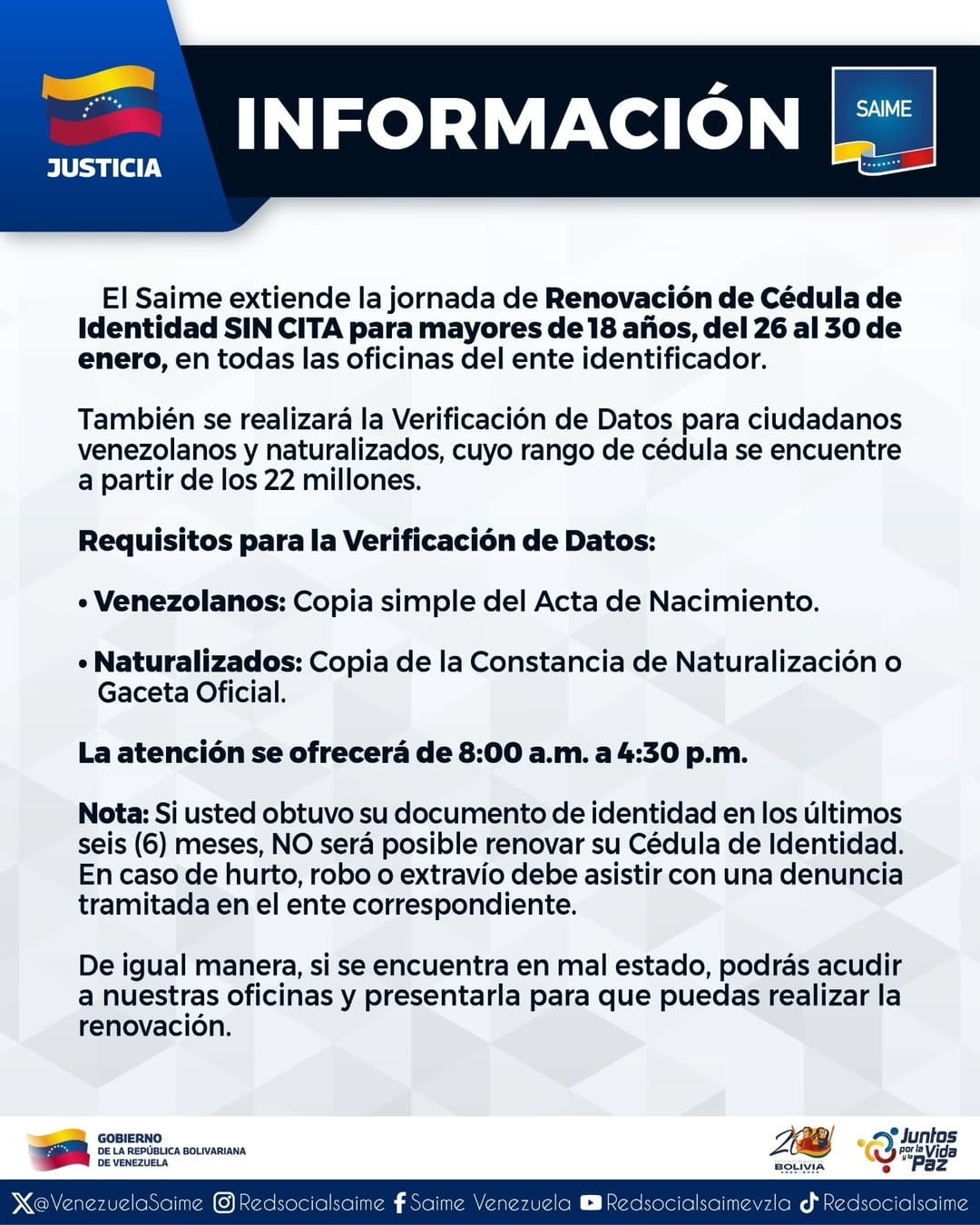 El Servicio Administrativo de Identificación, Migración y Extranjería (Saime) anunció la realización de una jornada nacional de renovación de cédula sin cita en todo el país desde este lunes 26 hasta el 30 de enero, desde las 08:00 am hasta las 04:30 pm.