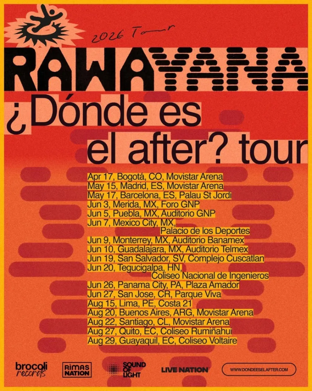 Con 17 shows confirmados hasta la fecha, Rawayana arrancará el 17 de abril en Bogotá, Colombia, y luego se trasladará en mayo a España con dos presentaciones en Barcelona y Madrid.