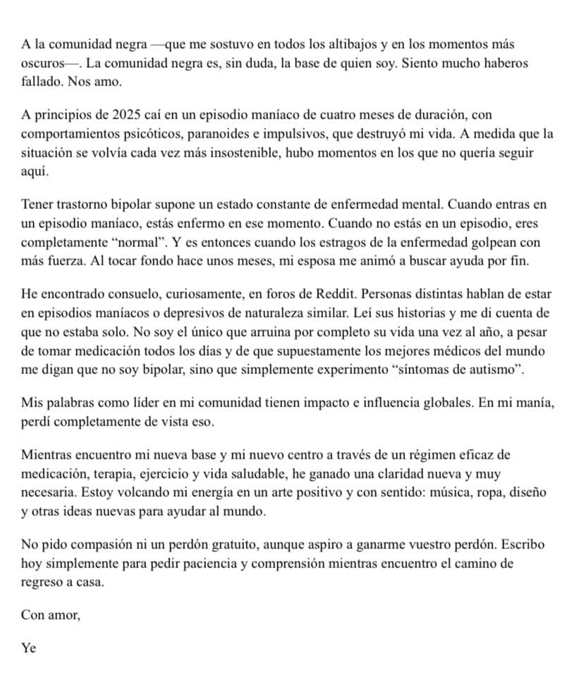 Bajo el título de «A todos los que he hecho daño», West, hoy conocido como Ye, habló sobre su trastorno de bipolaridad —que le fue diagnosticado en 2016—, señalándolo como la causa de su comportamiento errático.