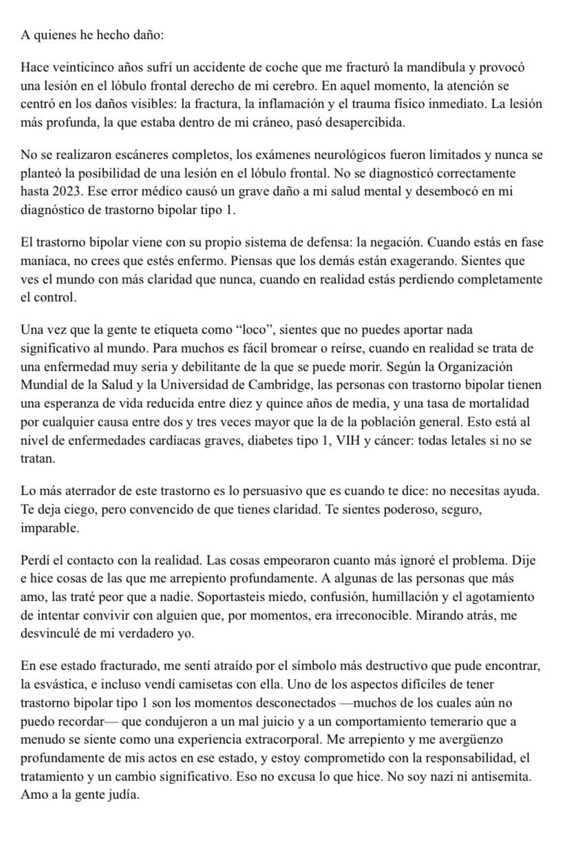 «Lamento y me avergüenzo profundamente de mis acciones en ese estado, y me comprometo a asumir mi responsabilidad, seguir un tratamiento y realizar un cambio significativo. Sin embargo, eso no justifica lo que hice. No soy nazi ni antisemita. Amo al pueblo judío».