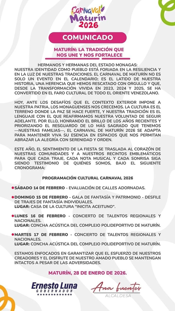 La alcaldía de Maturín y la gobernación del estado Monagas anunciaron este miércoles, 28 de enero, una serie de cambios a las actividades del Carnaval de la ciudad capital para «adaptarse y mantener viva su esencia».