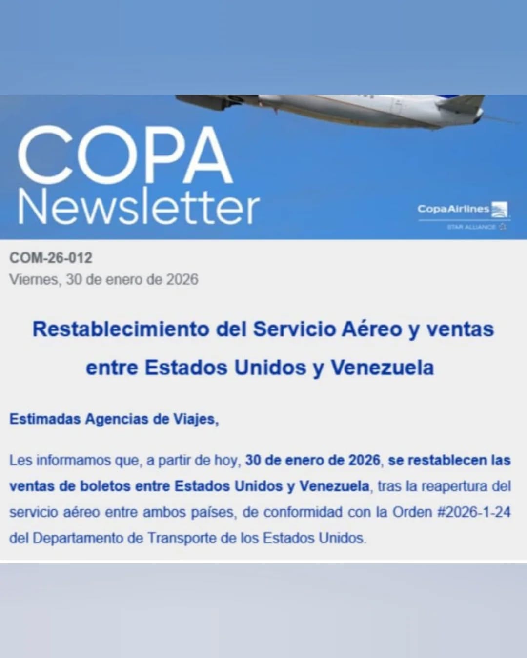 De acuerdo a un newsletter distribuido por la empresa, las agencias de viaje fueron notificadas que la medida tendrá «aplicación inmediata». Esto ocurre un día después de que el Departamento de Transporte estadounidense emitiera la Orden #2026-1-24 en la que se reabre el espacio aéreo venezolano para vuelos comerciales.