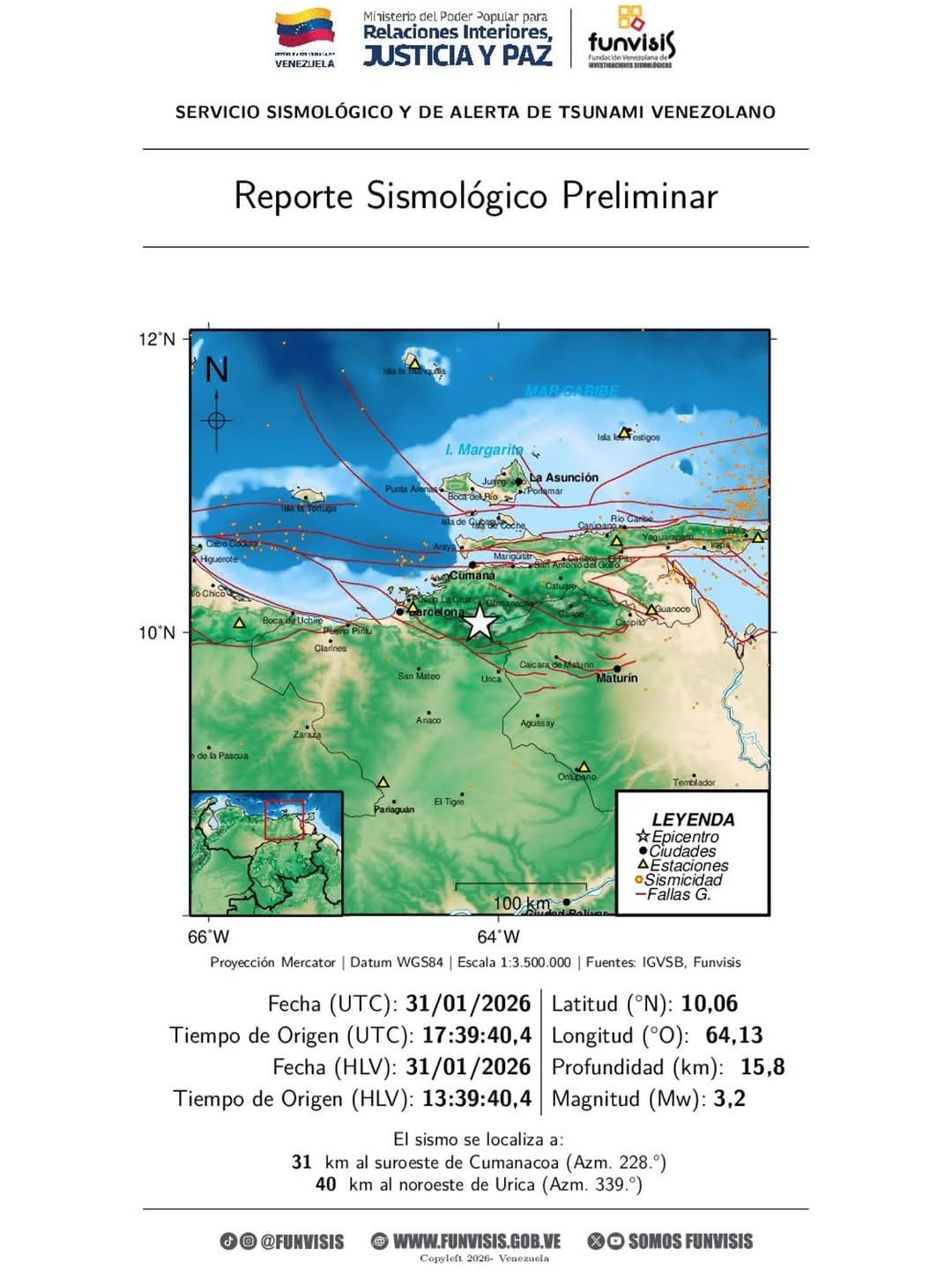 La Fundación Venezolana de Investigaciones Sismológicas (Funvisis), indicó que un sismo de magnitud 3.2 se registró en la población de Cumanacoa, estado Sucre, durante la tarde de este sábado, 31 de enero.