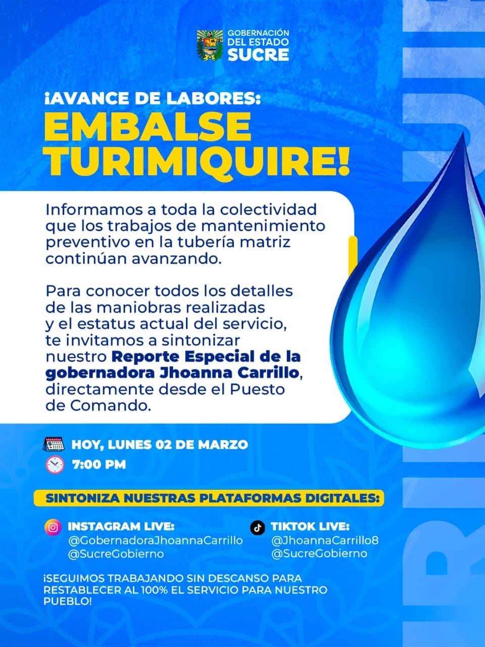 La Gobernación del estado Sucre informó que continúan las labores de intervención en la tubería matriz del Embalse Turimiquire y que este lunes, 02 de marzo, ofrecerá un balance sobre los trabajos realizados durante horas de la madrugada.