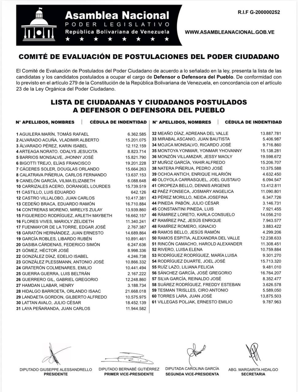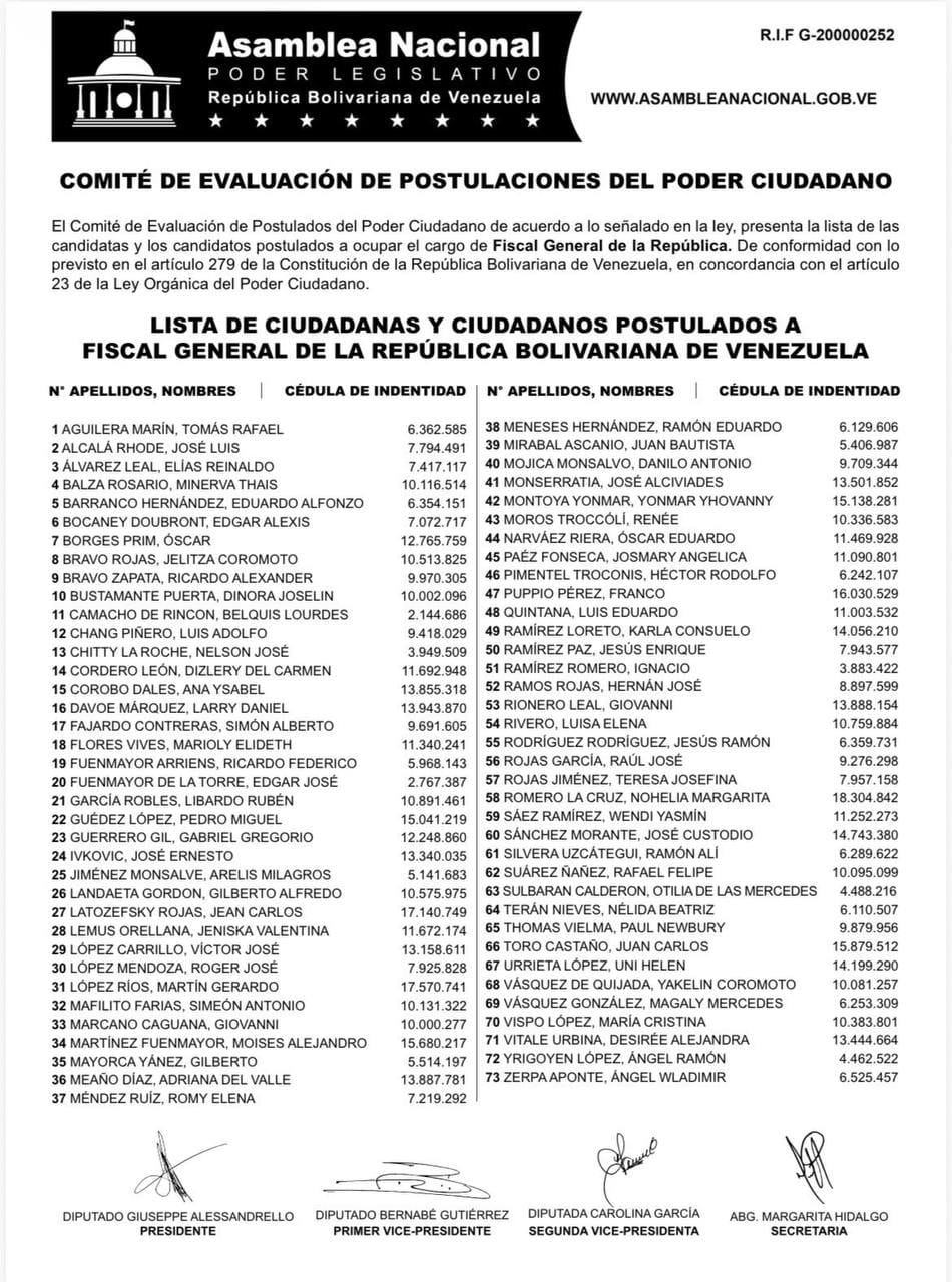 La Asamblea Nacional (AN) publicó la lista de ciudadanos postulados a los cargos de fiscal general y defensor del pueblo, de acuerdo a lo establecido en el artículo 279 de la Constitución y el 23 de la Ley Orgánica del Poder Ciudadano.
