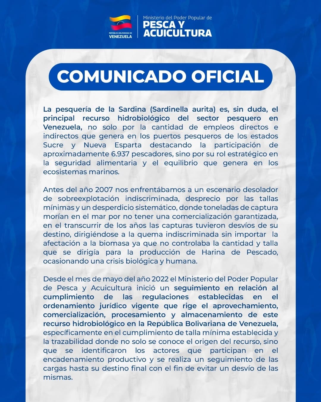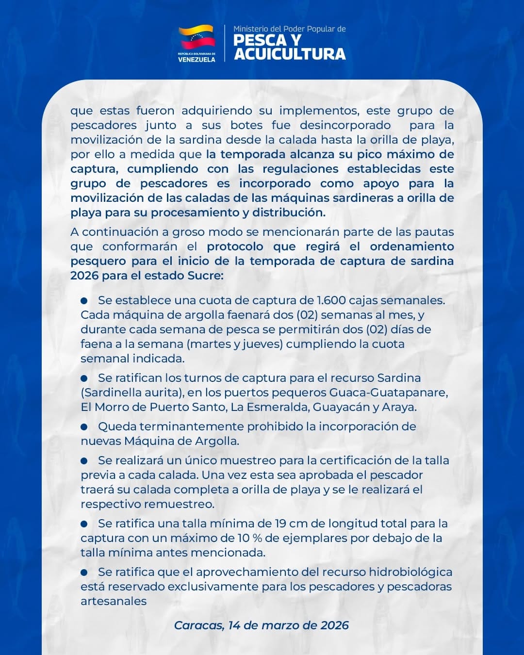 El ministerio de Pesca y Acuicultura (MinPesca) anunció este domingo, 15 de marzo, el arranque formal de la Temporada de Sardina 2026, con una serie de nuevos protocolos a seguir para el estado Sucre, principal productor del país.