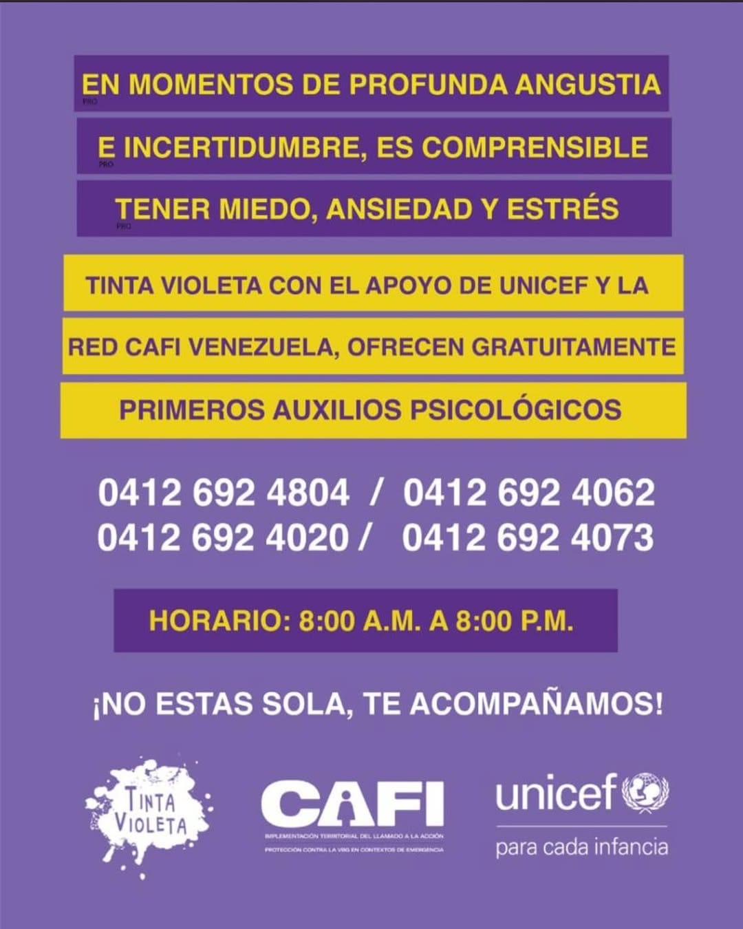 La Organización No Gubernamental (ONG) Tinta Violeta, con apoyo de la Unicef y la Red CAFI Venezuela, abrió una red telefónica de primeros auxilios psicológicos en Venezuela.