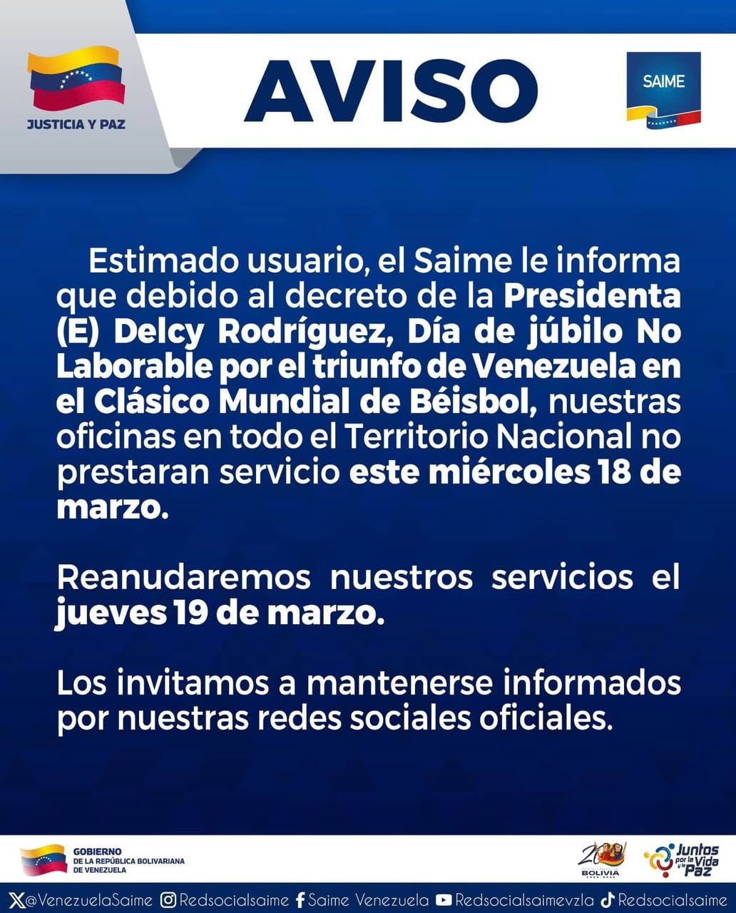 El Servicio Administrativo de Identificación, Migración y Extranjería (Saime), informó que no trabajará este miércoles, 18 de marzo, debido al decreto de Júbilo Nacional no laborable por el título de Venezuela en el Clásico Mundial de Béisbol.