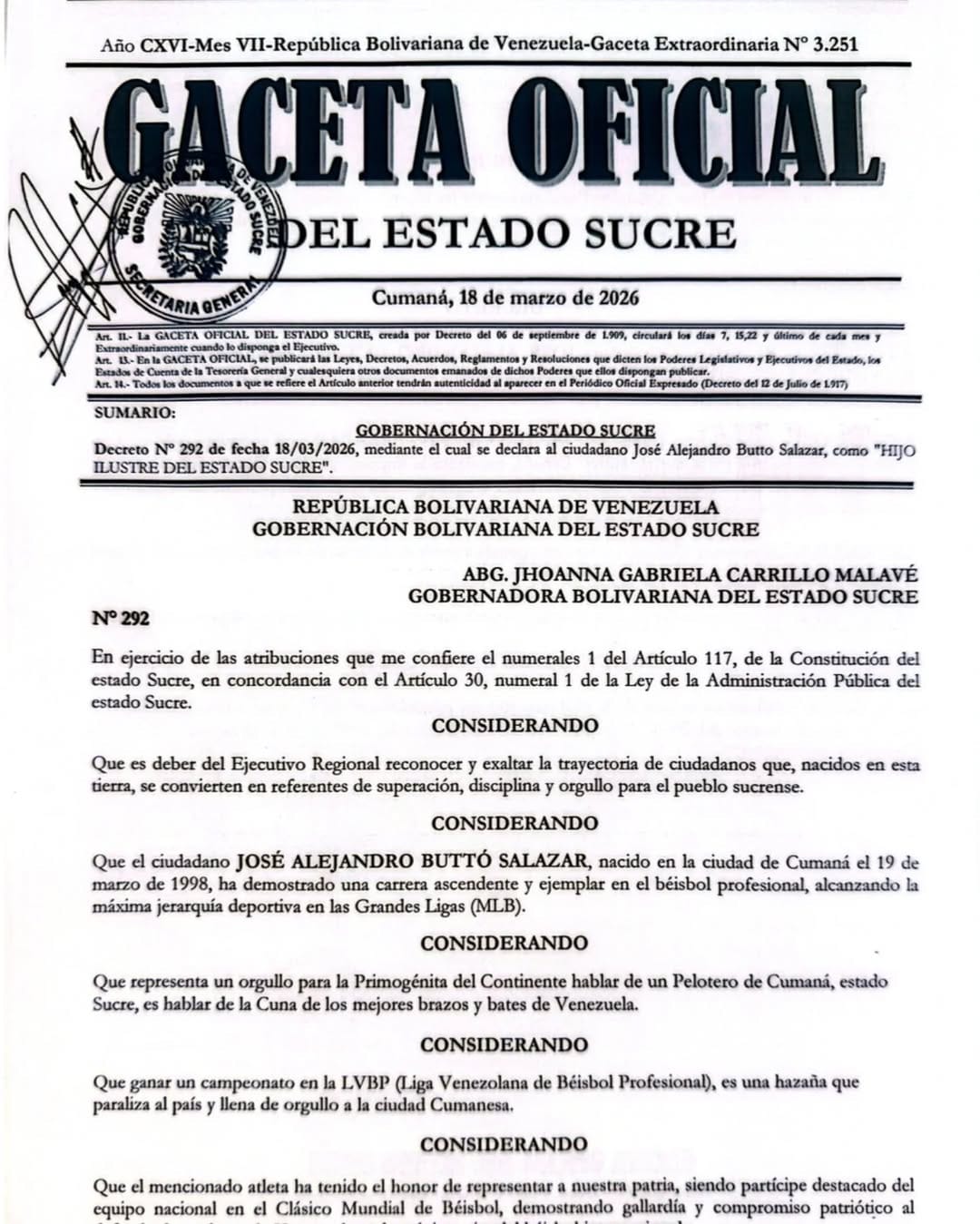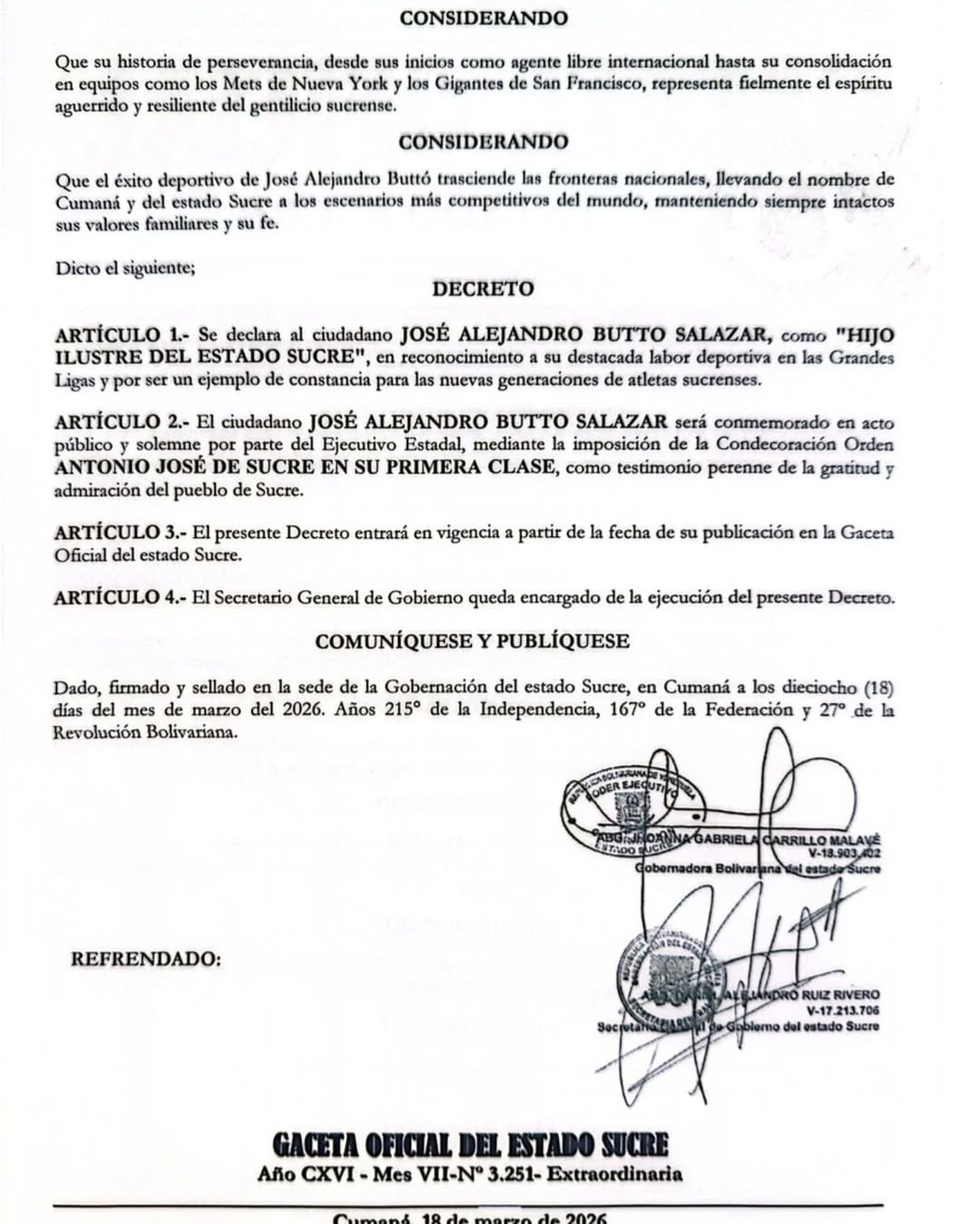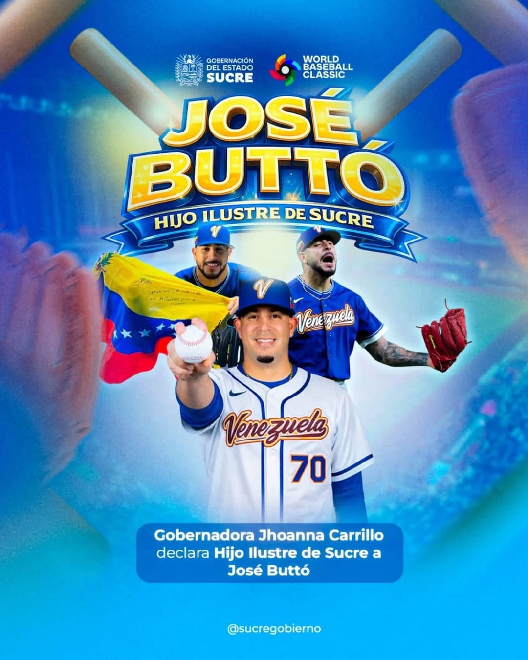 El beisbolista cumanés José Buttó fue declarado como Hijo Ilustre del estado Sucre tras coronarse campeón del Clásico Mundial de Béisbol junto a Venezuela.