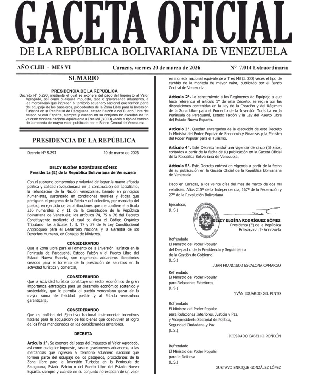 Mediante la Gaceta Oficial N° 7.014, con fecha del 20 de marzo, el gobierno nacional anunció la extensión de la paralización del cobro de impuestos por equipaje acompañado a los turistas que salgan del Puerto Libre de la Isla de Margarita y la Zona Libre de la Península de Paraguaná, estado Falcón.