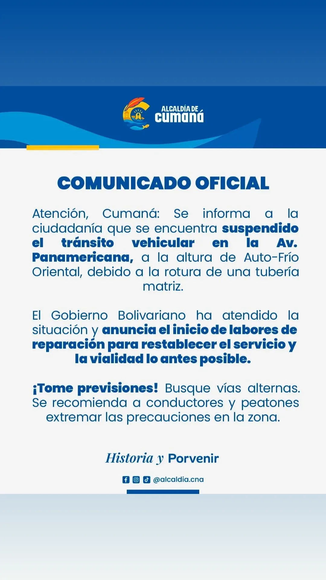 La alcaldía de Cumaná, estado Sucre, anunció el cierre del paso vehicular por la avenida Panamericana, a la altura de Auto-Frío Oriental, debido a la rotura de una tubería matriz.