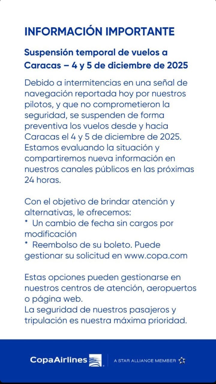 Por su parte, Copa Airlines aseguró que se encuentra evaluando la situación y que compartirá nueva información durante las próximas 24 horas.