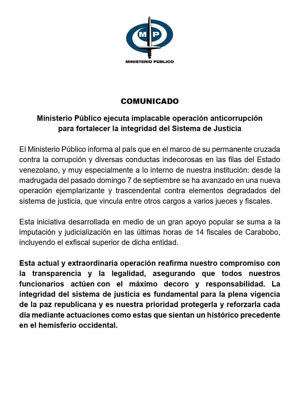 El fiscal general, Tarek William Saab, informó que 14 fiscales fueron detenidos en Carabobo como parte de lo que calificó como una «implacable operación anticorrupción», destinada a fortalecer el sistema de justicia. Entre los detenidos figura el exfiscal superior de la entidad.
