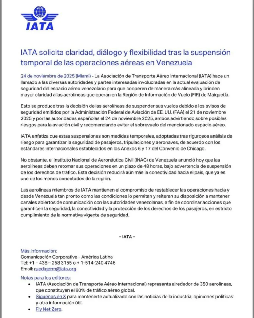 Cabe destacar que las aerolíneas Iberia, Air Europa, TAP, Turkish Airlines y LATAM decidieron retirarse temporalmente de Venezuela como respuesta a los avisos de seguridad emitidos el pasado 21 de noviembre por la Administración Federal de Aviación de Estados Unidos (FAA) y la Unión Europea (UE). Dichos avisos alertaban sobre posibles riesgos en el espacio aéreo venezolano, recomendando evitar sobrevolar el mismo.