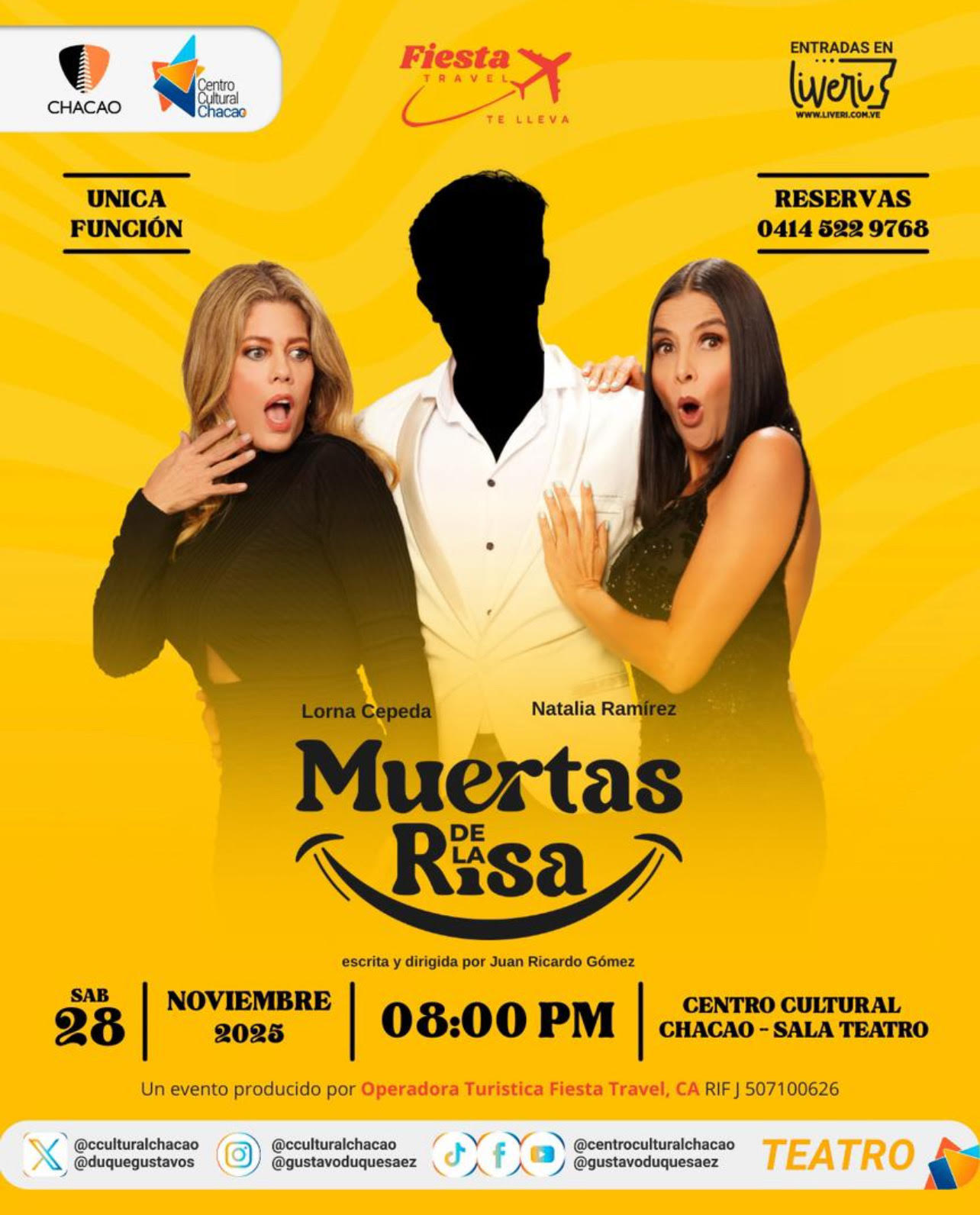Las actrices colombianas Lorna Cepeda y Natalia Ramírez llegarán a Venezuela para presentar la obra Muertas de la risa, un montaje teatral que combina humor con reflexiones sobre la vida y las relaciones humanas. La función está prevista para el 28 de noviembre en el teatro del Centro Cultural Chacao, en Caracas.
