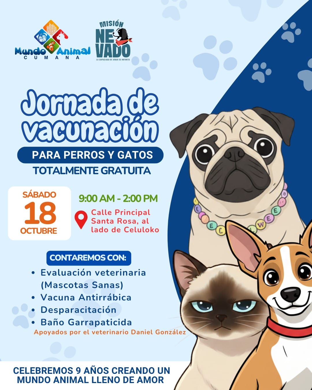 La tienda para mascotas Mundo Animal, en conjunto con la Misión Nevado, realizará una jornada de vacunación para perros y gatos el próximo 18 de octubre en Cumaná, estado Sucre.
