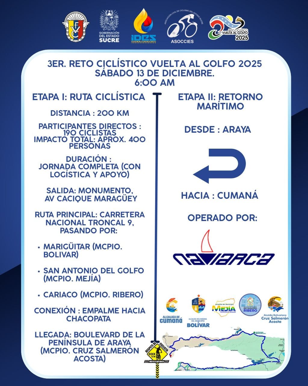 Cabe destacar que el evento reunirá a 190 ciclistas, que partirán desde el sector El Monumento de Cumaná y tendrán como destino final el boulevard de la península de Araya, municipio Cruz Salmerón Acosta.