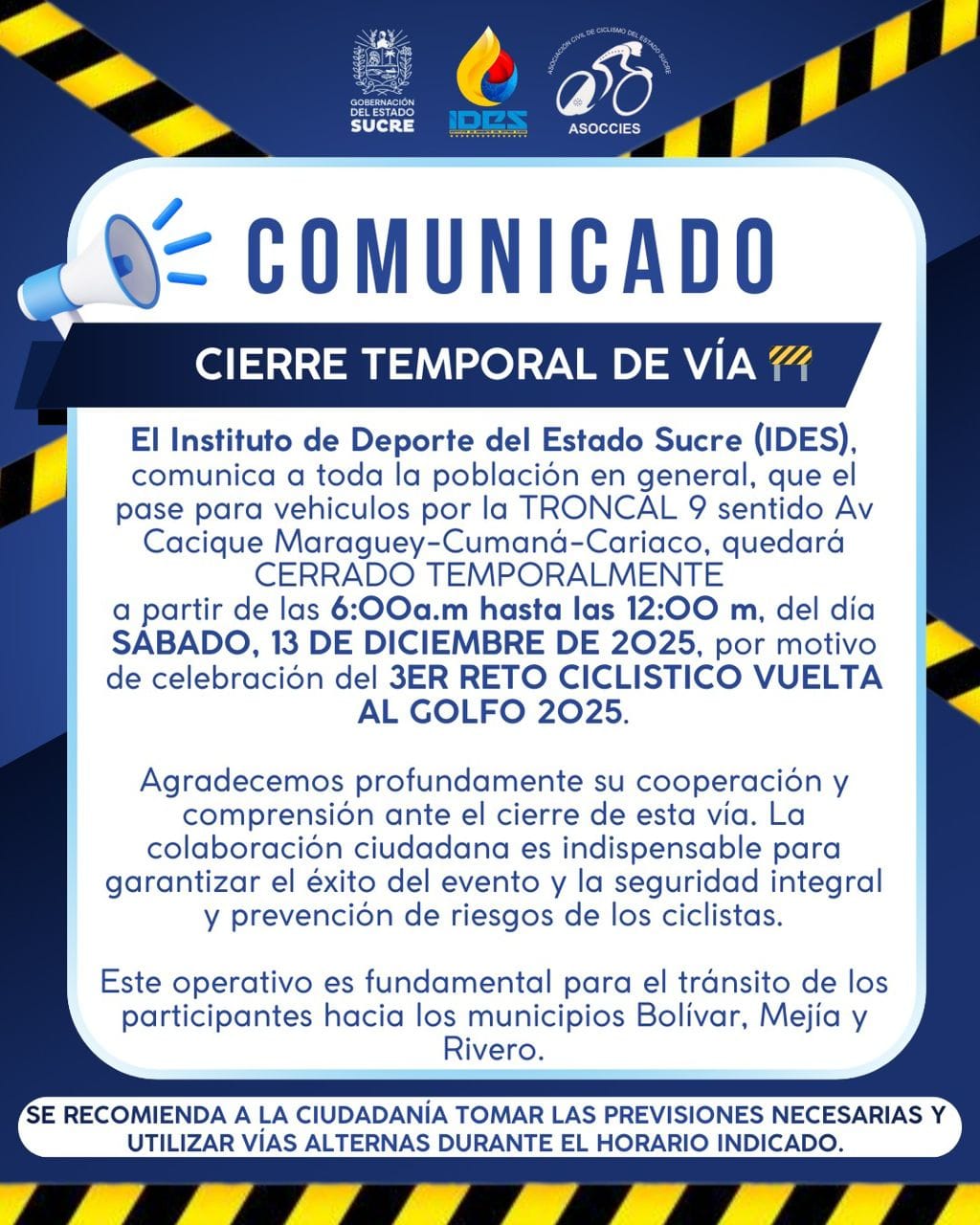 El Instituto de Deportes del Estado Sucre (Ides) anunció este viernes, 12 de diciembre, que el paso por la Troncal 9, sentido avenida Cacique Maragüey-Cumaná-Cariaco estará cerrado temporalmente.